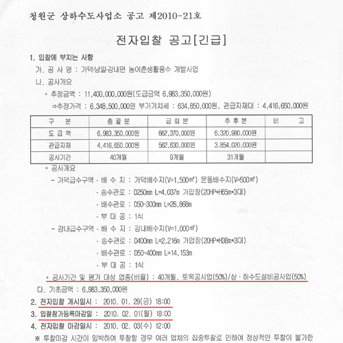 또한 토목공사업(통상 종합건설 몫)과 하수도설비공사업(전문건설 몫)을 같은 50%로 공고했다. 공정에 따라 사업비용의 차이가 있는데도 이를 무시하고 나눠주기 식으로 공평하게(?) 2등분한 것이다.