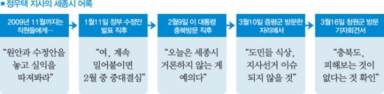 16일을 기점으로 정 지사의 세종시 전략은 4개월 전으로 완전히 회귀했다. 정 지사는 이날 청주시와 청원군을 방문한 뒤 가진 기자회견에서 “세종시 원안추진이라는 소신에는 변함이 없지만 세종시 때문에 충북도가 피해를 보는 것이 없다는 것을 확인한 뒤 자신감을 회복하게 됐다”고 주장했다. 이는 단순한 회귀가 아니라 ‘수정도 받아들일 수 있다’는 논리에 접근했다고 봐도 과언이 아닐 정도다.