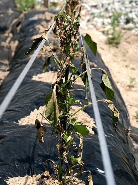 ▲ 충북 증평군 증평읍 미암리에서 고추를 재배하는 최모씨는 최근들어 2600여㎡의 밭에 심은 8500여 포기의 고추 70% 이상이 말라 죽고 있다며 원인 규명을 호소하고 있다.7일 최씨의 고추밭에서 말라 죽고 있는 고추