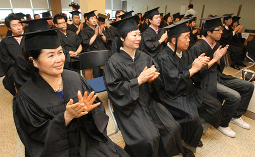 청주 최고 상권인 성안길 점포 경영인 54명이 학사모를 썼다.