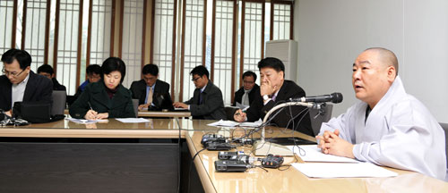 조계종은 13일 오전 서울 견지동 조계사 불교역사문화회관에서 원담 대변인이 참석한 가운데 기자회견을 열고 정부·여당의 4대강 사업, 종교 차별, 전통문화 훼손, 여당의 예산안 단독처리 등을 비난했다.