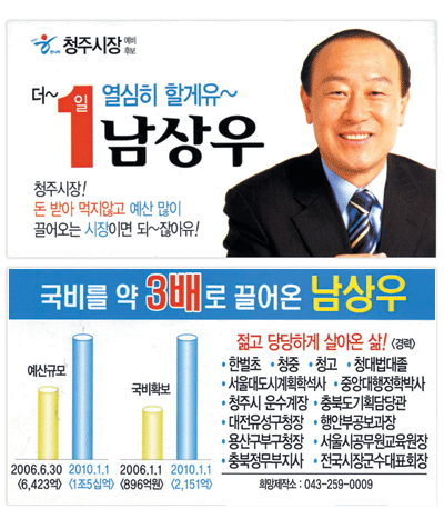 남 전 시장은 지난해 6·2 지방선거 때 선거명함 앞면에 ‘청주시장! 돈 받아 먹지 않고 예산 많이 끌어오는 시장이면 되잖아유!’라고 표기하고 뒷면에는 ‘국비를 약 3배로 끌어온 남상우’라고 적었다. 선거기간 동안 가장 강조한 것 역시 이 것 이었다. 선거 사무실 벽면과 홍보물을 온통 장식한 것도 예산에 관한 부분이었다. 그는 취임 당시인 2006년 예산이 6423억원 이었으나 2010년에 1조51억, 국비도 2006년에 896억원 이었으나 2010년에 2151억원으로 늘렸다고 한 껏 홍보했다.