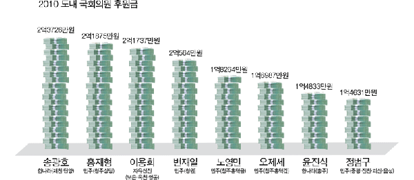 중앙선거관리위원회가 11일 공개한 ‘2010년도 정당 후원회 등의 수입지출 내역’에 따르면 도내 8명의 국회의원이 지난해 거둬들인 정치후원금은 모두 15억2617만원으로 의원 1인당 평균 1억9000여만원이었다.