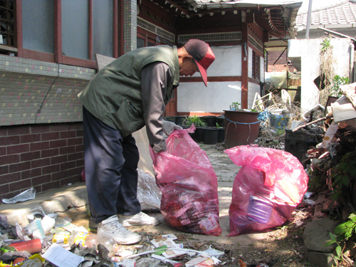 구 법원 옆 작은 골목길로 들어가 한 음식점 옆 빈집에서 김영훈(가명·78)할아버지를 만났다. 15일, 일요일이었다. 김 할아버지는 이날도 나와 폐지를 줍고 있었다. 한 음식점의 도움으로 김 할아버지는 폐지를 수거해간다. 음식점이 폐지와 쓰레기들을 모아 옆 빈집에 쌓아놓으면 김 할아버지가 2~3일에 한번씩 가져가고 있다. 조건은 주변을 깨끗하게 청소도 해주는 것이다. 할아버지는 “쓰레기를 밖에 버리는 사람이 죄 짓는 거지, 줍는 사람이 죄를 짓거나 부끄러운 것이 아니”라며 허리 숙여 청소를 계속했다.