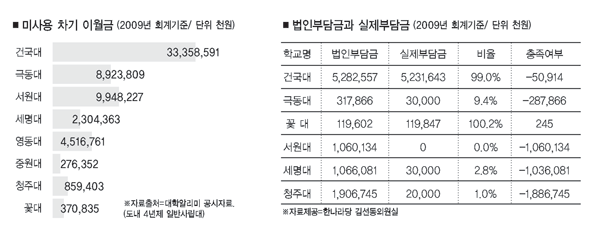 문제는 법인 부담금을 내지 않은 대학 상당수가 거액의 적립금을 확보하고 있다는 점이다. 서원대학교는 2009년 말 현재를 기준으로 법인 적립금은 0원이었으나 교비 적립금은 무려 323억 3503만 6000원이었다. 청주대학교는 법인 적립금 6억 6892만 9000원에 교비 적립금을 합칠 경우 2193억 5432만 4000원에 이르렀다. 순수 법인 적립금이 가장 많은 곳은 꽃동네현도사회복지대학교로 116억 1685만 5000원이었으나 전체 적립금은 150억 1769만 9000원으로 두 사립명문에 미치지 못했다. 이 밖에도 건국대 법인적립금은 5498만 4000원으로 교비를 합칠 경우 408억 5644만 3000원, 극동대 7000만원, 세명대 1304억 6164만 2000원이다.