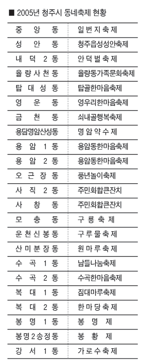 현재 청주시가 동네축제를 따로 지원하는 방안은 고려하지 않고 있다. ‘실패’로 보고 있기 때문이다. 하지만 주민자치가 활성화되면 동네축제 및 동네신문 발간 등을 통해 가장 확실한 변화를 꾀할 수 있다는 의견이 많다. 따라서 성공한 축제를 지원해 발전모델을 만들어내자는 주장도 설득력을 갖는다.