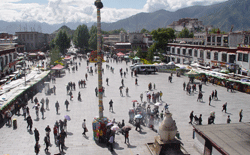 광장 한 편으로는 사원을 중심으로 왼쪽에서 오른쪽으로 도는 사람들이 있는데, 이것을 코라를 돈다고 한다. 코라를 도는 것은 세상 모든 생명체의 행복을 기도하는 것으로 이곳에서는 여행자라 할지라도 반드시 왼쪽에서 오른쪽으로 돌아야하며 운이 좋으면 먼 길을 오체투지로 이곳에 도착한 순례자들을 만날 수 있다. 그런 티베트인들 사이로 총을 든 푸른 제복의 사나이들이 여기저기 보인다. 혹시라도 티베트 인들이 독립을 요구하는 시위라도 일어날까봐 감시하는 무장군인들이다.