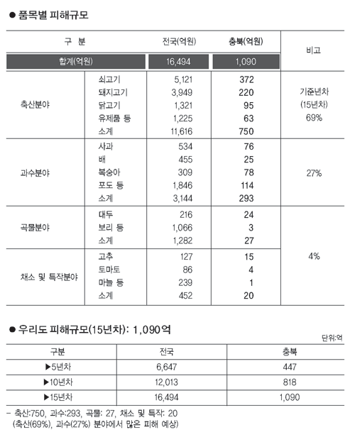 도는 한·미 FTA 발효시 도내 농업 피해 규모를 15년 차에 이르러 축산 750억원, 과수 293억원, 곡물 27억원, 채소 및 특작 20억원 등 총 1090억원으로 보고 있으며, 15년간 누적손실액은 8300억원으로 예상하고 있다. (표 참조)