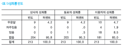 응답자 가운데 직장상사로부터 성희롱을 당한 경우는 없었다. 단지 1명만이 “동료로부터 성희롱을 당한 적이 있다”고 응답했다. 이에 반해 적지 않은 수의 노동자들이 서비스이용자의 성희롱에 노출되어 있는 것으로 나타났다. 종사자 10명 중 1명꼴로 서비스이용자로부터 성희롱을 경험했거나 자주 경험했다는 것이다.<표1>
