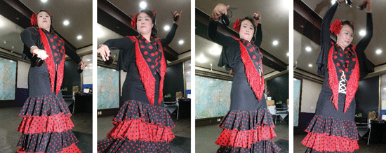플라멩꼬 의상은 꽤 화려하다. 머리에 꽃 모양의 화려한 헤어핀을 꼽고 만난 그는 춤을 즉석에서 보여줬다. 캐스터네츠, 부채, 망토 등이 춤의 도구가 된다.