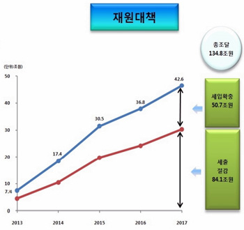 정부는 최근 박근혜 대통령의 공약 이행에 필요한 134조 8000억 원 중 50조 7000억 원은 세입 확충으로 조성하고, 84조 1000억 원은 세출 구조조정으로 충당키로 했다.