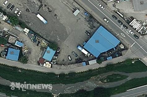 흥덕구청이 운영하는 행정 전산망에는 더 정교하게 나타나 있었다. 이 전산망에는 항공 사진 위에 필지의 경계부분이 노란 실선으로 표시돼 있었고 정비소 건물이 하천부지를 침범한 범위까지 뚜렷이 표시돼 있었다.