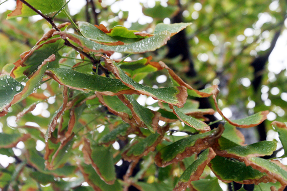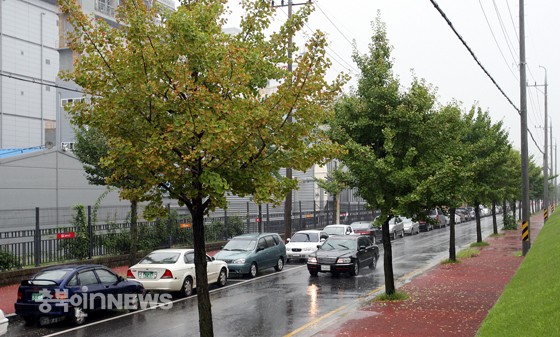 이 사이에 있는 가로수 수백그루는 정도의 차이만 있을 뿐 잎 끝부분이 붉게 타들어 갔다. 김정수(농학박사) 전 시민환경감연구소장이 ‘불산으로 인해 나뭇잎이 타들어 가는 현상’으로 지적한 전형적인 모습이었다.