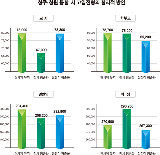 결론적으로 4개의 설문 집단은 현 체제 유지를 가장 많이 선호했다. 교사, 학부모, 일반인이 현체제 유지를 선호했고, 학생들만이 전체평준화를 원했다. (‘청주청원 통합시 고입전형의 합리적방안’ 도표 참조)