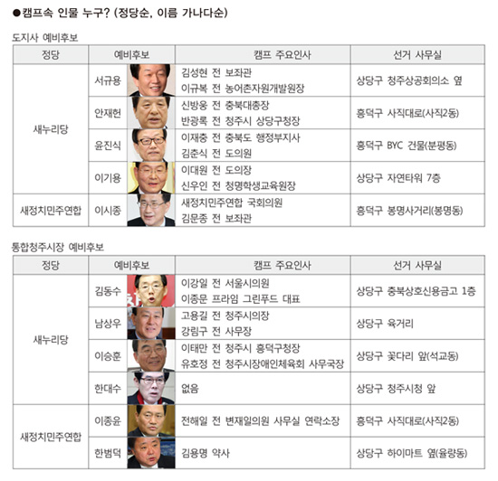 뜨거운 관심을 받고 있는 도지사·통합청주시장 예비후보들의 캠프는 어디이며 누가 뛰고 있을까. 지난 15일 새누리당이 공천신청을 마감한 결과 이변은 없었다. 도지사 선거 새누리당 공천을 신청한 사람들은 서규용(66) 전 농림부장관, 안재헌(65) 전 여성부차관, 윤진식(68) 국회의원, 이기용(69) 전 충북도교육감 등이다. 새정치민주연합은 이시종(67) 현 지사가 유일하다.