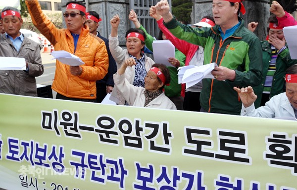 지난 17일 충북도청 정문 앞에 칠순 내외의 미원면 주민들이 어색한 모습으로 집회를 열었다. 집회참석자들은 2012년부터 시작된 미원-운암간 도로확포장공사부지로 편입된 토지 소유주. 이 공사는 청주지역 외곽순환도로를 연결하는 중요한 사업이다. 이들 주민들은 공사 계획이 수립될 당시 대부분 환영했다고 밝혔다.