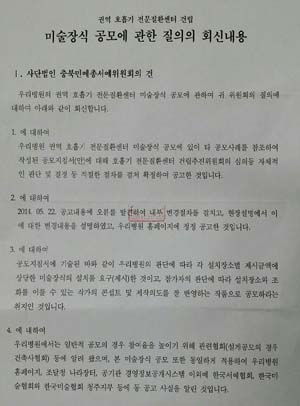 무엇보다 공공건물임에도 불구하고 미술장식품을 구매할 때 특정 단체에 대행을 맡기거나 일부 고가의 외부 작품은 이미 내정하는 등 투명한 공모하고는 거리가 멀었다.