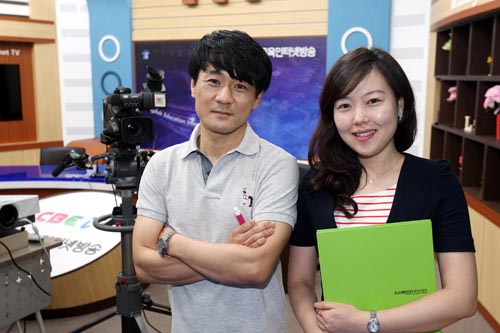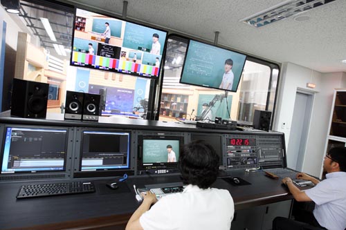 채광희(진천고 교사․36)는 충북도교육정보원 영상제작 스튜디오안의 카메라 앞에 섰다. 그는 학교에서 수업할 내용을 촬영했다. 강의를 마친 후 땀을 흘리면서도 표정이 밝다. “올해 5월부터 거꾸로 교실 수업을 100% 진행하고 있어요. 우선 교사가 수업을 동영상강의로 제작하는 것부터 출발해요. 처음에는 원래 수업시간에 익숙해져 40분정도 분량이 나왔는데 이제는 20분으로 줄여서 하고 있어요. 너무 길면 흥미도가 떨어지기 때문이에요.”