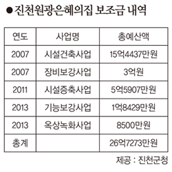 2011년 은혜의집은 건물을 증축한다며 진천군에 증축비용 지원 요청했다. 424㎡를 증축하겠다는 은혜의집의 요청에 대해 진천군은 그해 사업비 5억5097만원의 지원을 결정한다. 군으로부터 지원을 받은 은혜의집은 2012년 공사를 완료했다.