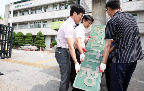 통합청주시 출범을 앞둔 지난 6월26일 옛 청원군청 정문에 붙인 ‘청원군청’과 ‘청원군의회’ 현판을 인부들이 떼어냈다. 청주시와 청원군이 1946년 6월 미 군정 법령에 따라 청주부와 청원군으로 갈린 뒤 68년 만이다. 이곳에는 1일부터 청주시 상당구 임시청사와 청주시 별관으로 쓰인다. 떼어낸 현판은 대청호 미술관에 보관된다.