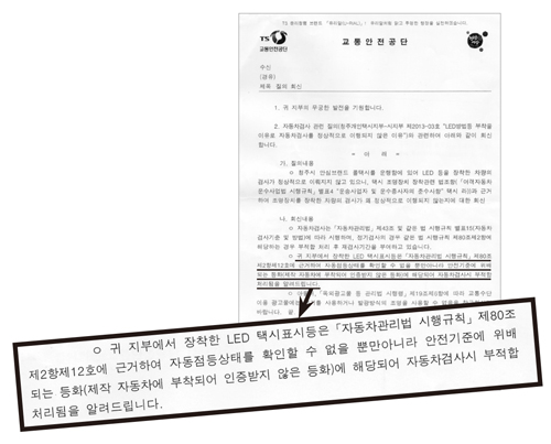 교통안전공단은 이를 근거로 정기적으로 이뤄지는 자동차 검사에서 LED 표시등이 장착된 차량은 부적합 판정 조치를 취했다.