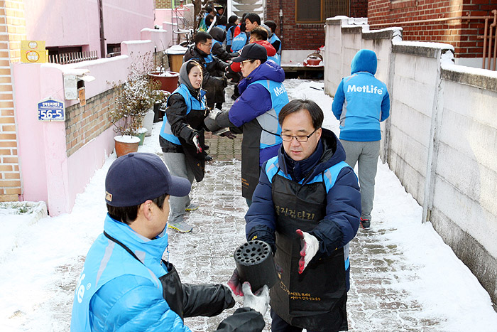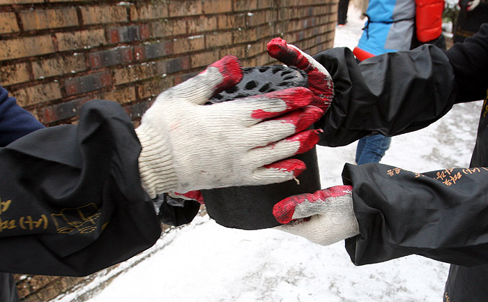 ▲ 연탄 한 장씩 들고 줄선 사람들의 배달 손길이 아직은 서툴다. 주거니 받거니 하다 몸놀림이 꼬이자 한바탕 웃음보가 터졌다. 처음에는 꽁꽁얼었던 몸이 연탄 200여장을 옮기자 이마에는 구슬땀이 맺혔다. 한파가 몰아친 지난 8일 아침, 메트라이프생명 청주지점 사우회 직원들이 청주시 내덕동 골목길에서 줄지어 연탄 배달을 하고 있는 풍경이다. 이들은 사랑의 아나바다 경매를 통해 기금을 모아 5가구에 1000장의 연탄을 전달했다. 내덕동에 사는 황진우(가명)씨는 “한겨울에 500장을 태우는데, 연탄창고 가득 찬걸 보니 마음까지 따뜻하다”며 고마움을 표시했다.