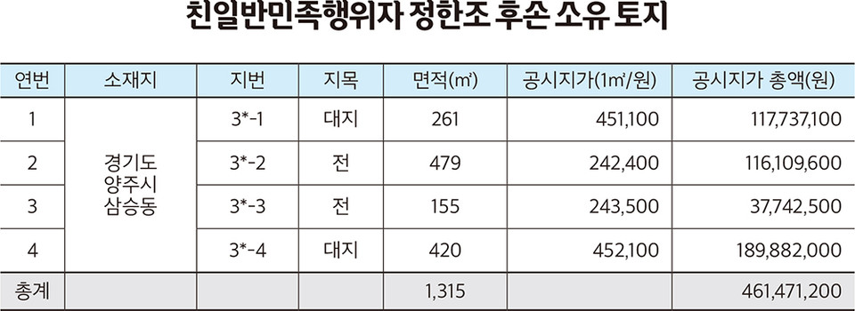 A씨가 법무부에 국가귀속 신청을 한 토지는 총 4필지(1315㎡)로 공시지가는 2025년 기준 4억6147만원에 이른다. 현재 이 토지는 정한조의 아들 정천모((鄭天謨, 일본식 이름: 東川天謨히가시카와 덴보, 1895~1955)과 손자를 거쳐 증손자가 소유하고 있다.